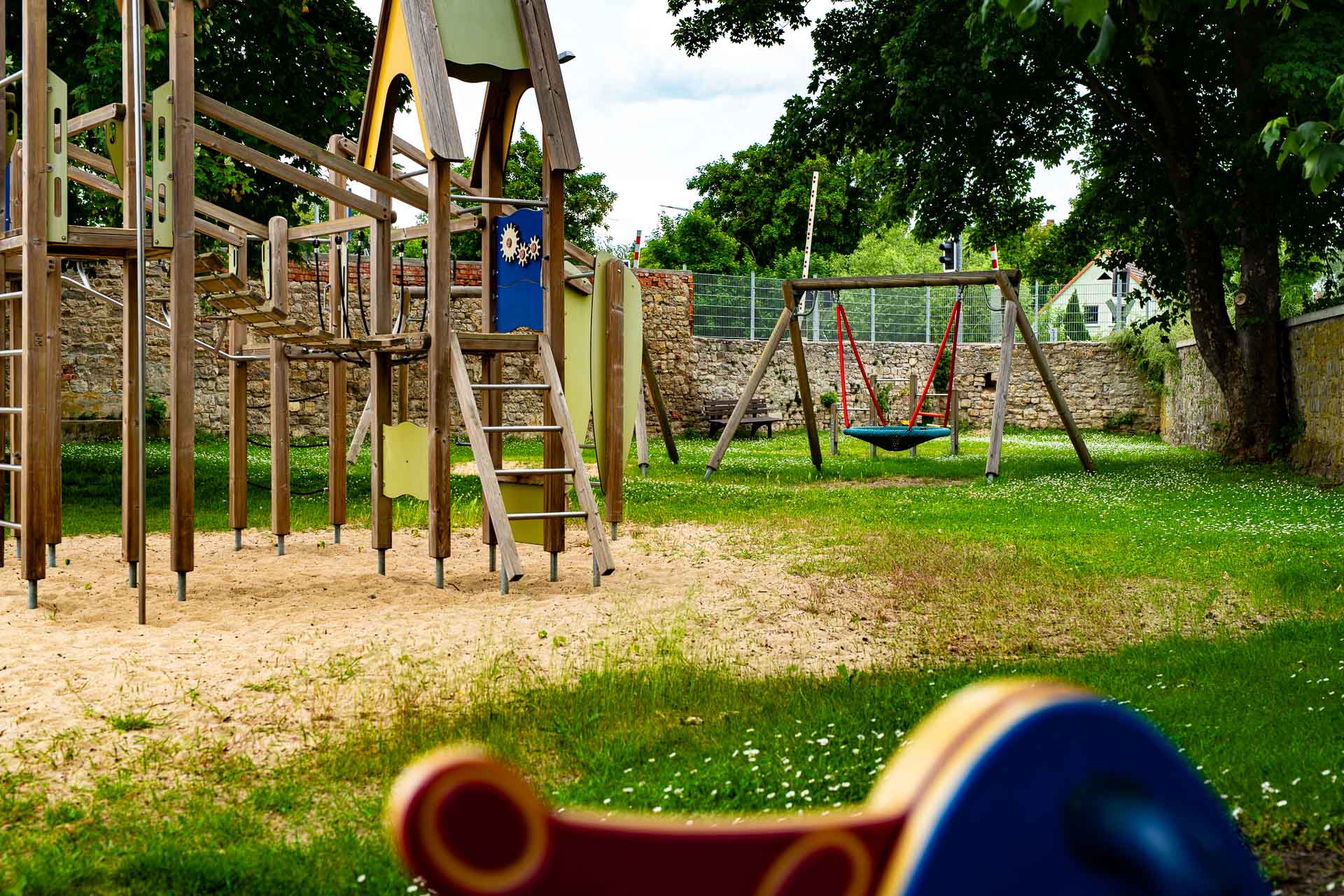 Die nähere Umgebung und die Burg, welche fußläufig zu erreichen sind, bieten reichlich Abwechslung, um Bewegung, das Spiel und die daraus resultierenden Bildungsprozesse der Kinder zu fordern und zu fördern. In unmittelbarer Nähe befinden sich der Spielplatz, das Feuerwehrdepot, der Bahnhof und eine Autowerkstatt.